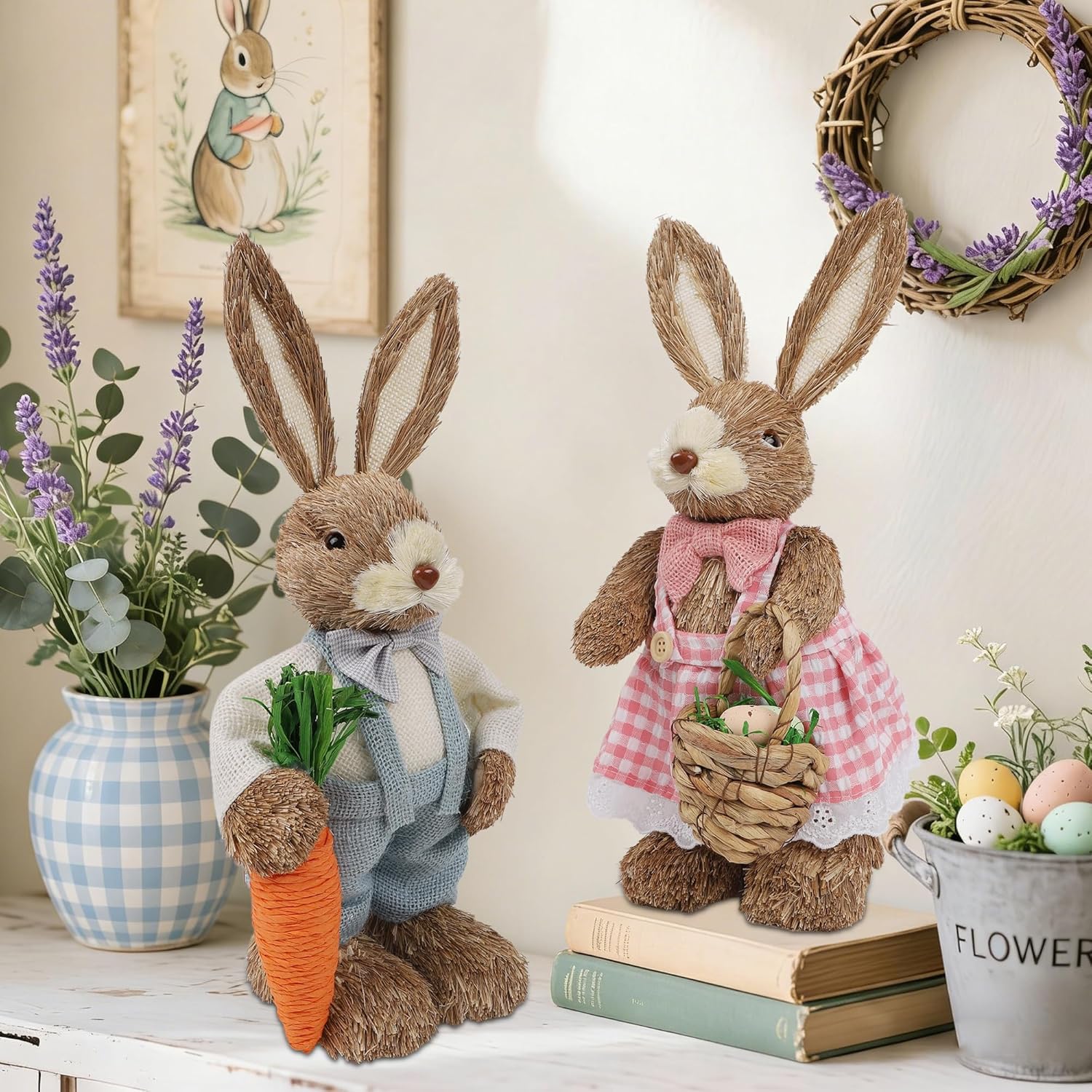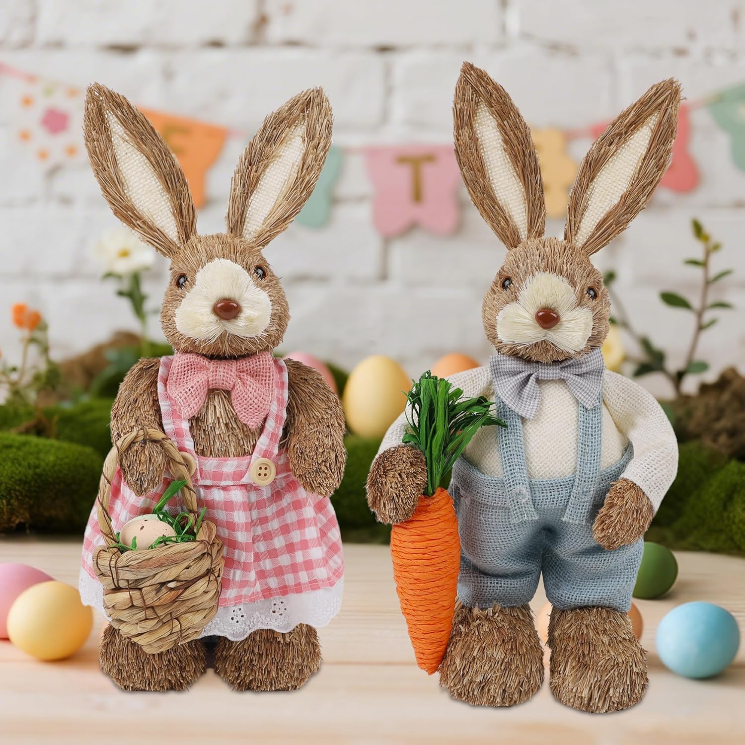 Presentamos nuestra pareja de conejitos de paja, el conejito caballero luce su pajarita y lleva una zanahoria, simbolizando la generosidad de la primavera. Junto a él, la dama conejita, con su vestido rosa y sosteniendo una canasta de huevos de Pascua, irradia el calor de la temporada.